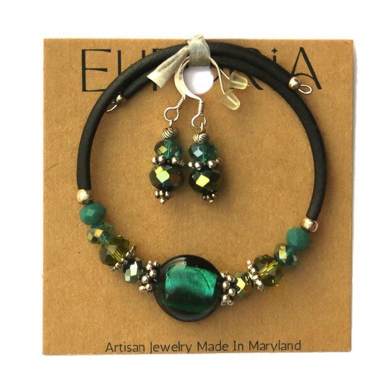 Wrap Bracelet & Earring Set - Emerald Green Silver Foil Glass
