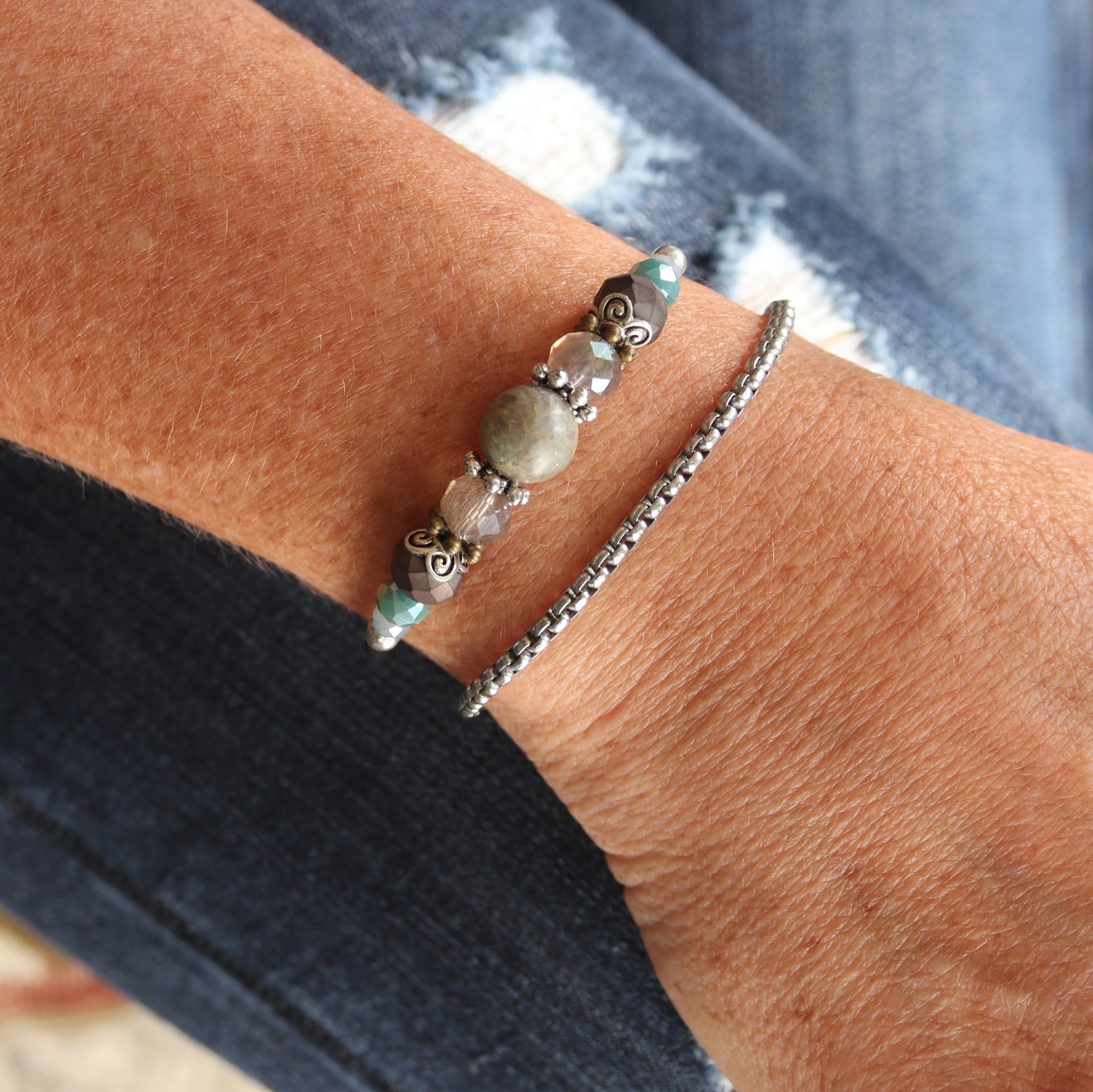 Super comfortable silicone covered flexible wire makes these beautiful bracelets a long time best selling item. So easy to put on with no clasp needed - the wire stays in it's circular shape and nicely wraps around your wrist. One size fits most.