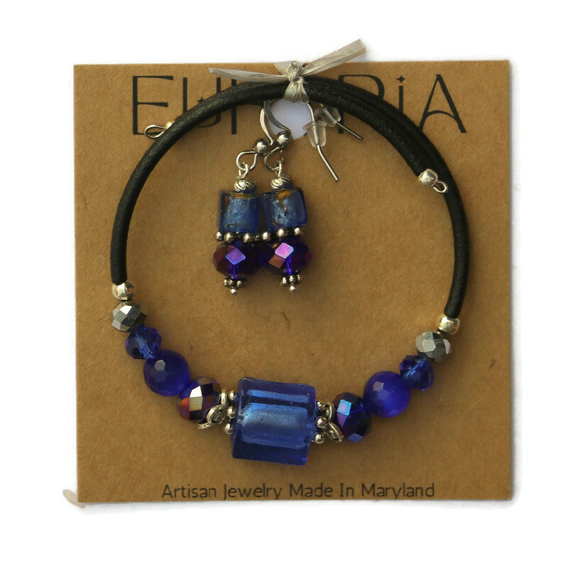 Wrap Bracelet & Earring Set - Cobalt Silver Foil Glass