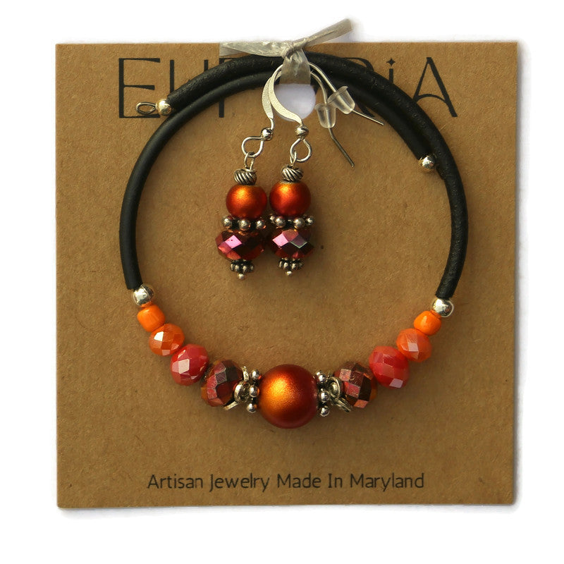 Wrap Bracelet & Earring Set - Iridescent Fire Orange Glass