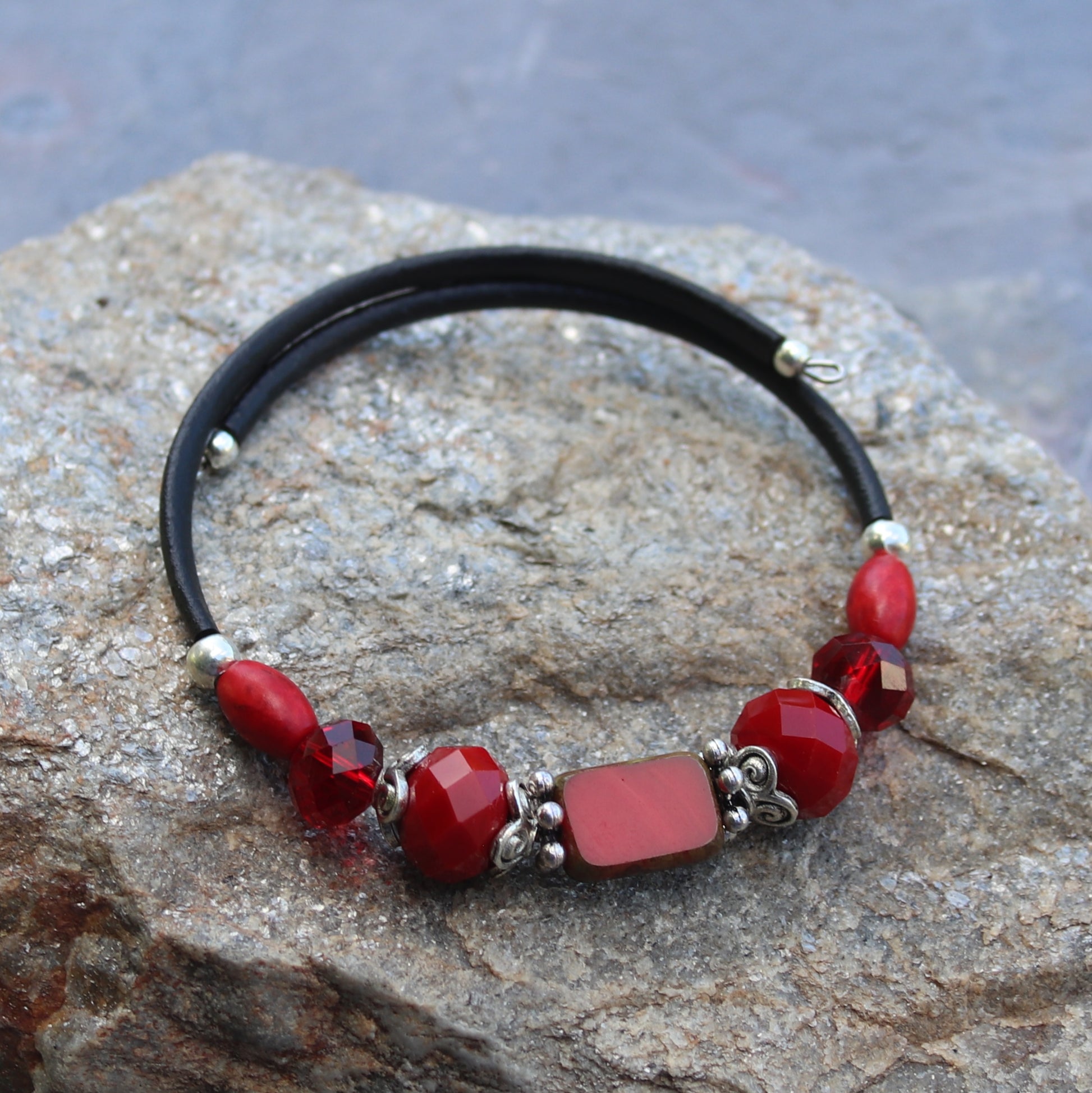 Super comfortable silicone covered flexible wire makes these beautiful bracelets a long time best selling item. So easy to put on with not clasp needed - the wire stays in it's circular shape and nicely wraps around your wrist. One size fits most.