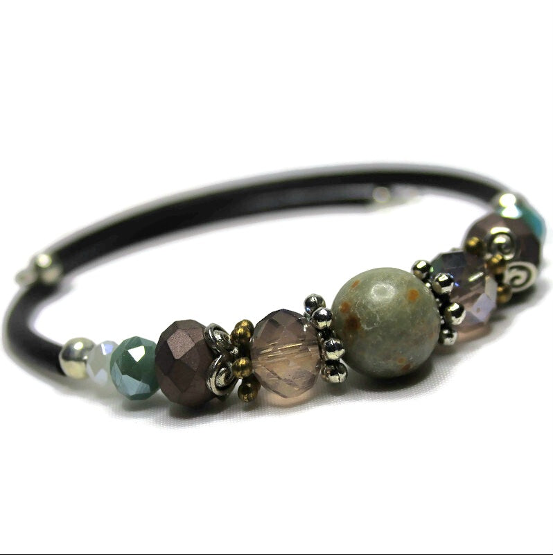 Super comfortable silicone covered flexible wire makes these beautiful bracelets a long time best selling item. So easy to put on with no clasp needed - the wire stays in it's circular shape and nicely wraps around your wrist. One size fits most.